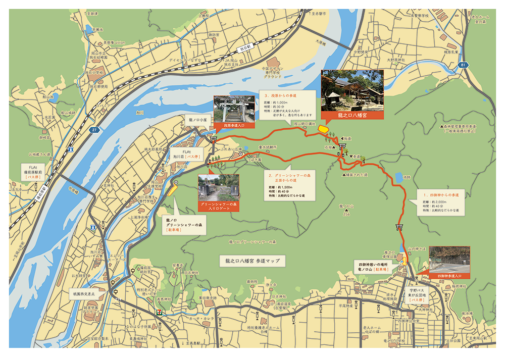 龍之口八幡宮へは龍ノ口山のふもとから歩いての参拝になります。下記1~3の何れかのコースを歩いてお参り下さい
